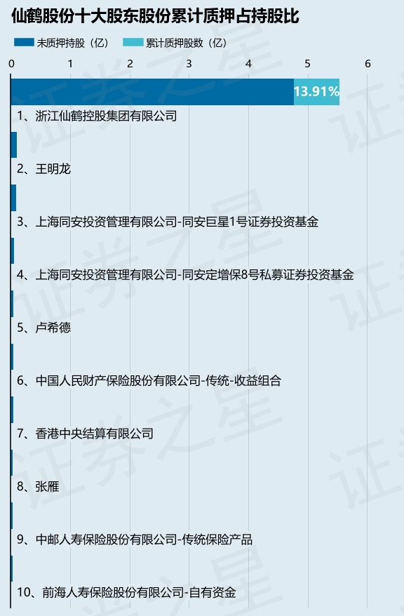 截止本公告日,股东浙江仙鹤控股集团有限公司已累计质押股份7700.0万股,占其持股总数的13.91%。本次质押后仙鹤股份十大股东的累计质押股份占持股比例(占持股比例的计算以公司最新一期财务报表公布的十大股东的持股总数为基准)见下图: