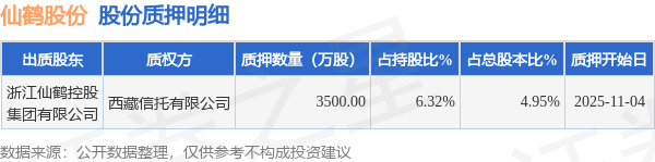 证券之星消息,仙鹤股份(603733)11月5日公开信息显示,股东浙江仙鹤控股集团有限公司向西藏信托有限公司合计质押3500.0万股,占总股本4.95%。质押详情见下表: