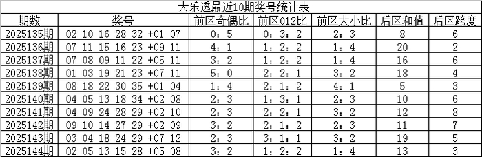 大乐透第2025144期奖号为:02 05 13 15 28+05 08。当期前区奖号012路比为1:2:2,冷热比为2:3,没有开出重号和连码,后区开出一奇一偶、一大一小组合。
