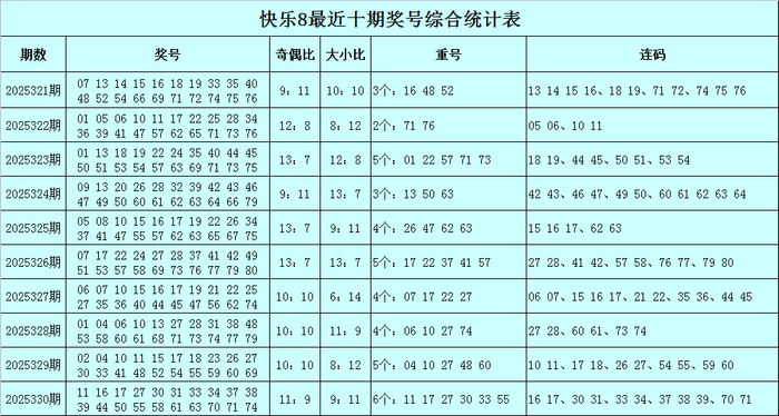 福彩快乐8第2025330期开出奖号:11 16 17 27 30 31 33 34 37 38 39 44 50 55 58 61 63 70 71 74,其中奖号奇偶比为11:9,大小比为9:11,包含6个重号11、17、27、30、33、55,包含连码16 17、30 31、33 34、37 38 39、70 71。