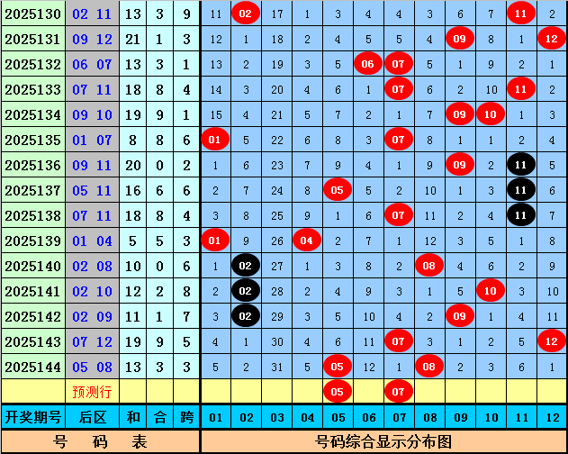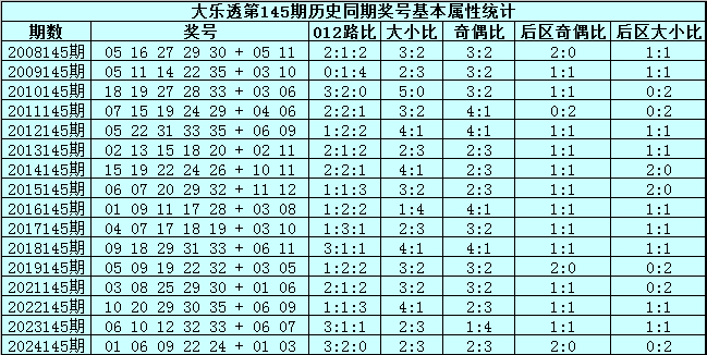后区判断:后区第145期历史同期奖号大小比总比例为2:14,大号出现较少,本期看好大号回补,注意一大一小,两码参考05、07。