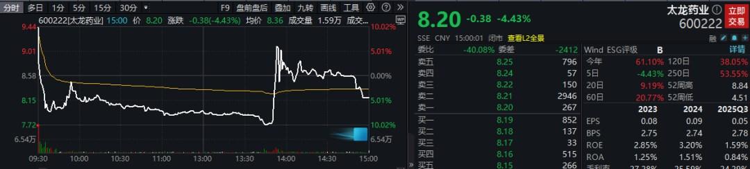 9日,以双黄连口服液出名的中药企业太龙药业以涨停价复牌,但很快该股股价直线跳水,迅速由红翻绿并于低位震荡。午后,太龙药业股价于盘中触及跌停,上演“天地板”,最终收跌4.43%。